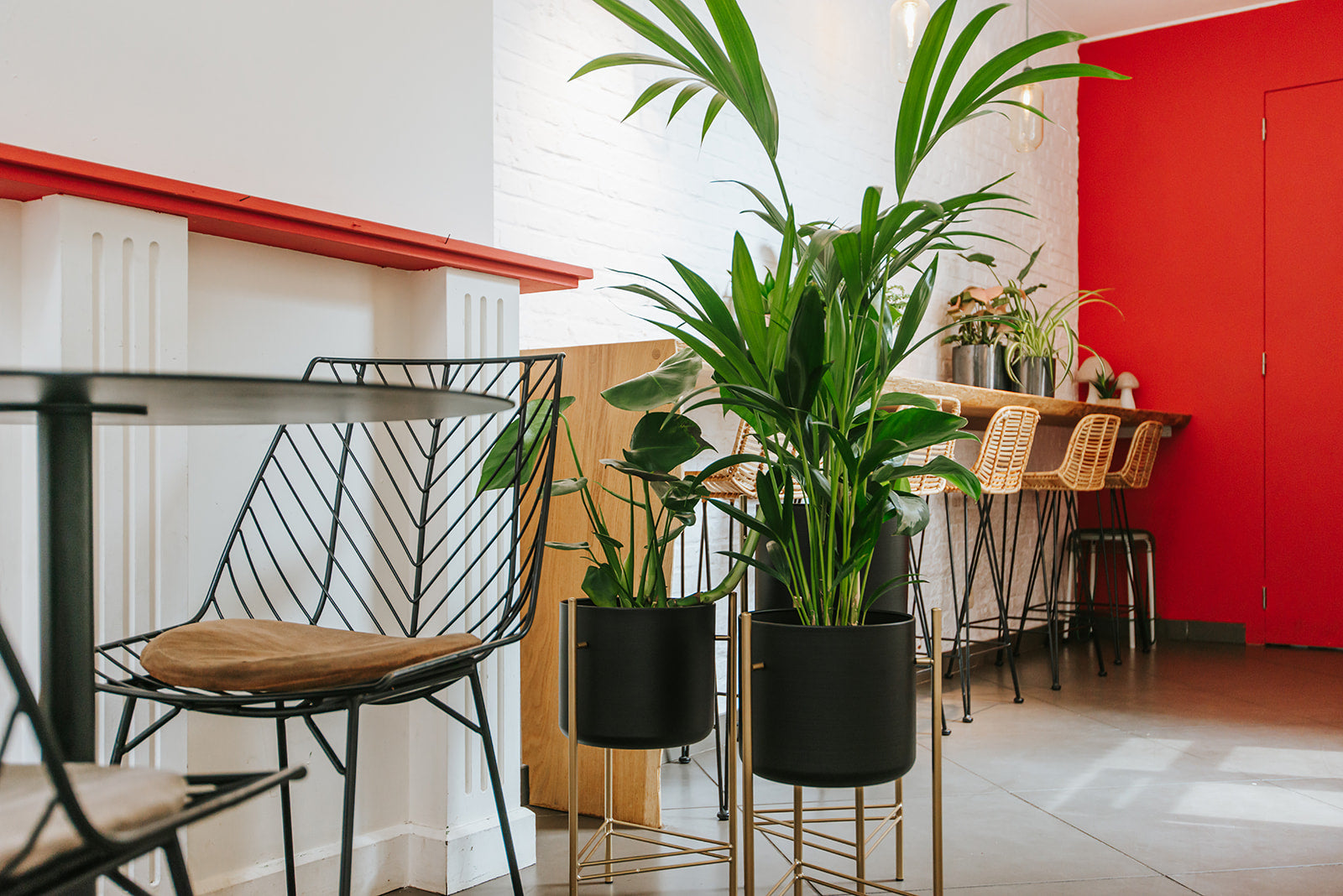 We kozen voor elegante potten, gecombineerd met een mix van luchtzuiverende en onderhoudsvriendelijke planten. Het resultaat is een interieur dat niet alleen mooi oogt, maar ook rust en balans brengt. De groene accenten zorgen voor een natuurlijke verbinding tussen de zitplaatsen, de toog en de ramen.