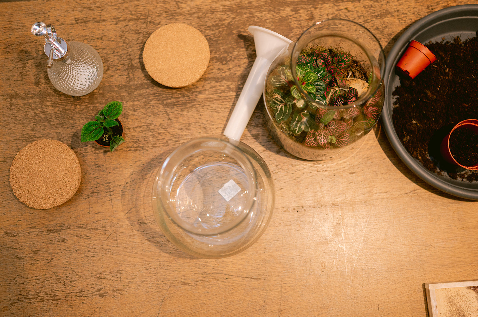 - Een terrarium (d23,5cmxh25cm) en alle nodige materialen & plantjes om het in te richten
