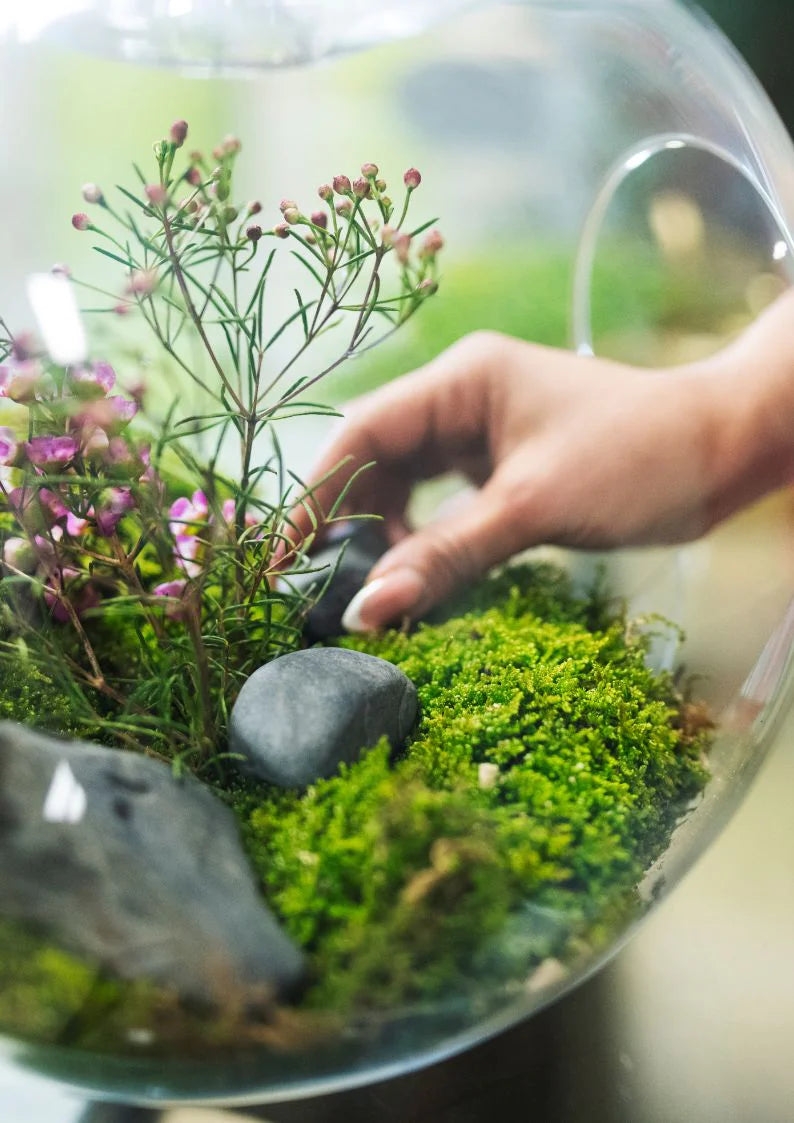 Alle benodigdheden voor de opbouw en decoratie van ons terrarium zijn inbegrepen bij deze workshop. Indien je toch nog graag je eigen decoratie (schelpen, edelstenen,…) meebrengt dan mag je dit altijd doen.